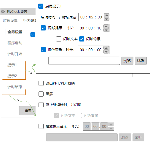 预定的演讲时间快结束了,您应该希望提示演讲者控制时间。这里您可以设置两个提示,时间到了后,将通过字体或背景的闪烁,以及音乐提示演示时间快结束了。