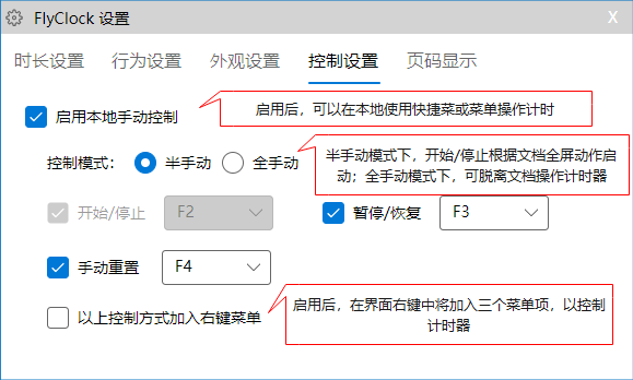 FlyClock具有高度的自动化,提前设定好运行参数后就会自动根据PPT/PDF进行计时提醒。但是有时一场会议会有一些难以预料的情况发生,比如领导插话、演讲者未及时放映PPT等情形,在此情况下,适当的人为干预就十分必要。此功能就为此而生。