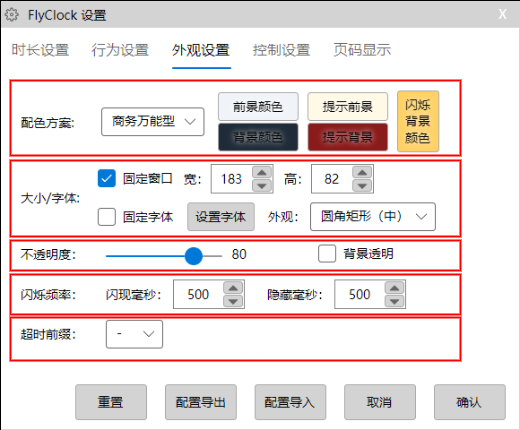FlyClock可以自由定制外观,包括配色、大小、字体等。选择确认后,相关设置不会立即生效,当点击【确认】关闭整体设置窗口时,设置会立即生效。