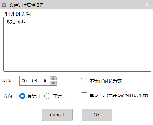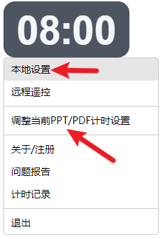 如果有可识别的文档,点击左键时,【调整当前PPT/PDF计时设置】可用,点击后,会弹出快速设置对话框;确定后,相应文件和设置将显示在【本地设置|时间设置】中。